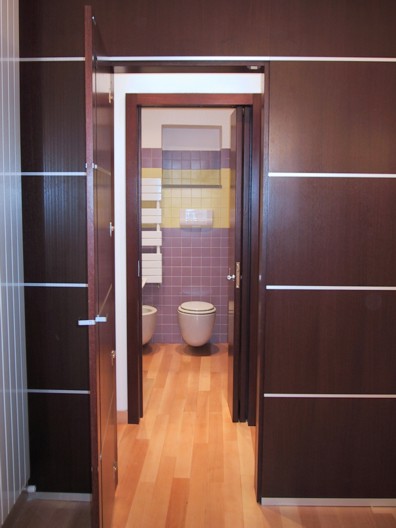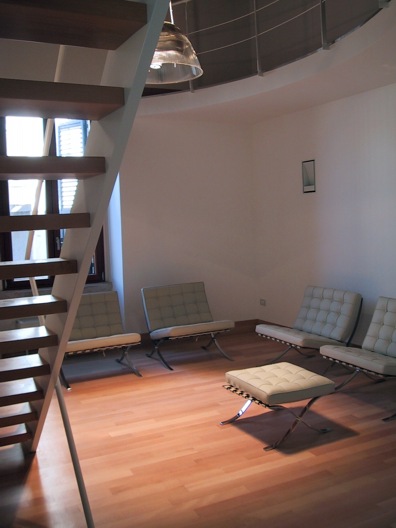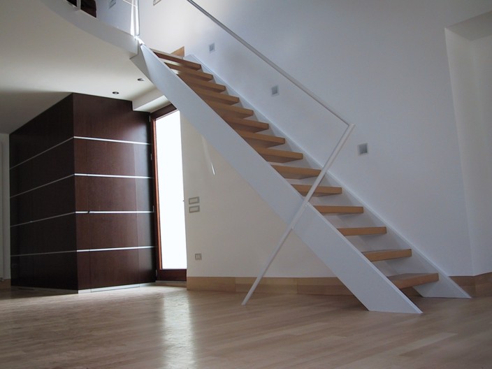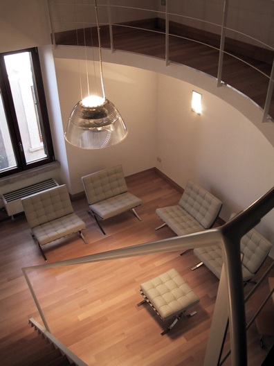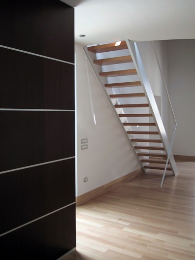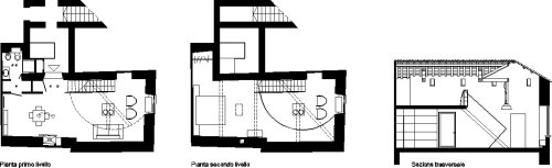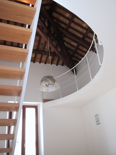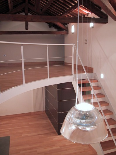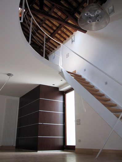 I locali oggetto della ristrutturazione erano originariamente divisi in due ambienti principali coperti con un sistema di finte volte a crociera. Durante i lavori, è venuto alla luce un sistema di copertura a capriate lignee e cotto della seconda metà del '700, che si è deciso di restaurare e rendere elemento focalizzante della progettazione. Le nuove altezze così ottenute hanno reso possibile la realizzazione di una doppia altezza che ospita la zona notte, mentre al piano terra si è individuata la zona living, con i servizi. Il progetto, dallo spazio all'arredo ai materiali, ruota intorno a pochi segni essenziali ma decisi, da un lato a dare una chiave di lettura immediata degli spazi e delle loro funzioni, dall'altro ad enfatizzare la complessità della copertura lignea a vista.